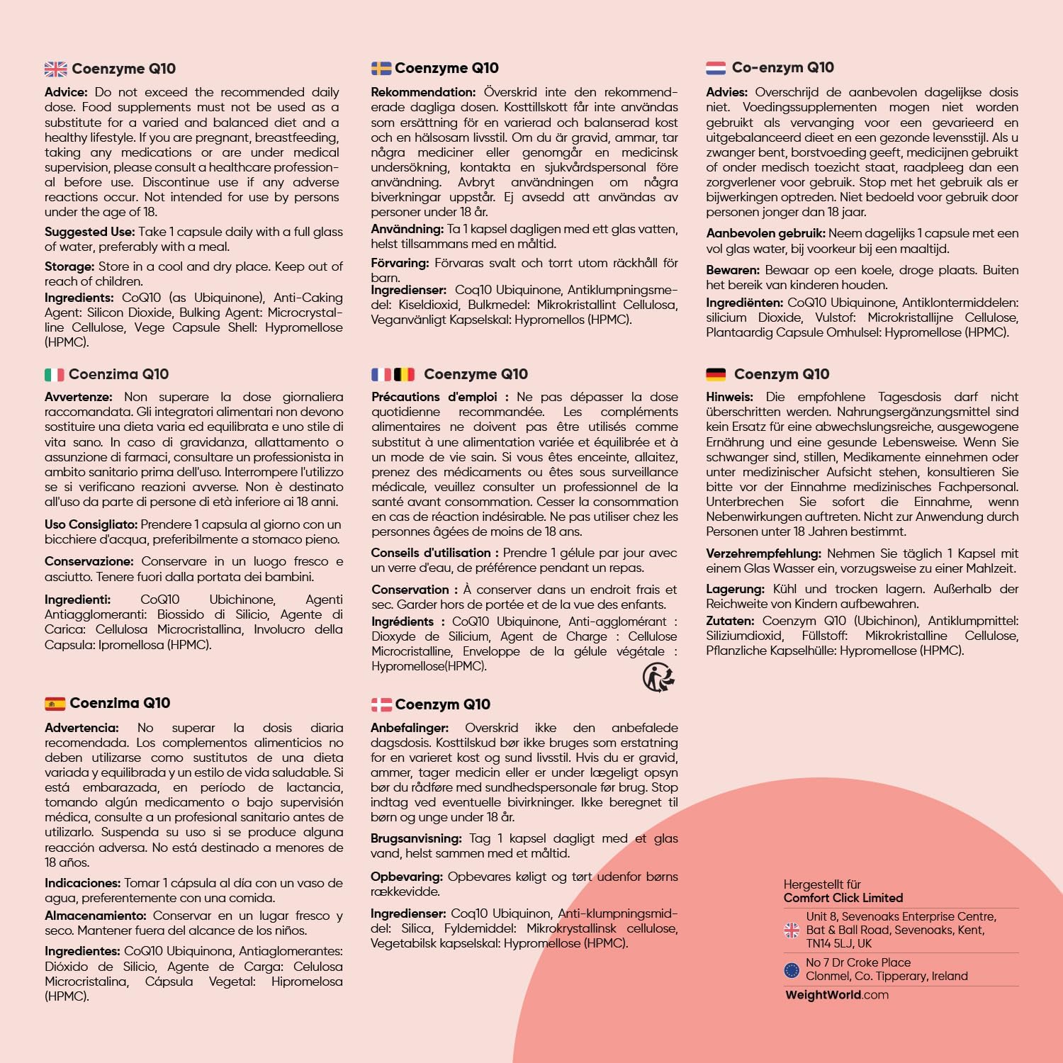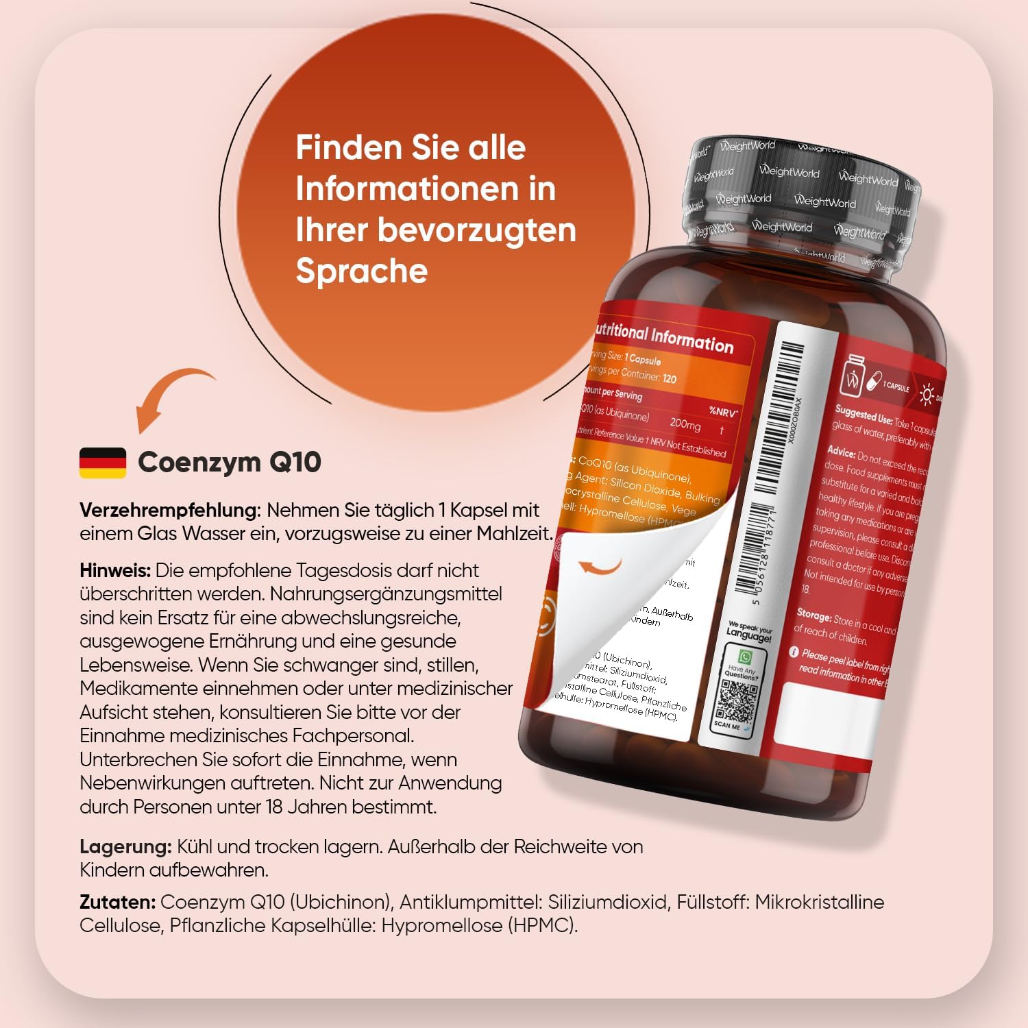 Q10 Coenzym - Coenzym Q10, auch bekannt als Ubichinon, ist ein natürlich vorkommender biochemischer Cofaktor. Dieses Nahrungsergänzungsmittel Produkt enthält 120 Kapseln, die je mit 200 mg Coenzym Q10 (CoQ10) gefüllt sind. Man nennt dieses Coenzym auch ‚Ubichinon‘ – weil es ‚ubiquitär‘ ist. Es gibt verschiedene Formen der Dosierung und Formen wie Liposomale CoQ10 Ubiquinol, Coenzym Q10 Ubiquinol. Q10 Conenzym - CoQ10 200mg ist in verschiedenen Lebensmitteln enthalten darunter Fleisch, Fisch und ganze Körner - allerdings in geringeren Mengen. Es wird empfohlen, 1 Kapsel täglich mit einem Glas Wasser und einer Mahlzeit einzunehmen. Coenzym Q10 (CoQ10) wird in Kombination mit dem Kollagen Komplex in einigen Supplements verwendet. Es wird als Bestandteil der gesamten Formulierung hinzugefügt. Frei von Magnesiumstearat - Magnesiumstearat ist ein üblicher Zusatzstoff, der in vielen Nahrungsergänzungsmitteln verwendet wird. Die CoQ10 Ergänzung ist jedoch frei von Magnesiumstearat, da es als unnötiger Zusatzstoff angesehen wird, um eine sauberere Formulierung zu erreichen. Dieses COq10 200mg ist für Männer und Frauen geeignet. Vegan & GMP - Das CoQ10 Produkt ist frei von Magnesiumstearat, Gluten und wird gemäß GMP Standards hergestellt. CoQ10 ist vegan und vegetarisch. Das Produkt wird mit einem Etikett in englischer Sprache geliefert. Das Etikett kann an der Seite abgezogen werden, dort sind alle wichtigen Informationen in deutscher Sprache. Entdecke WeightWorld - Aus einer Leidenschaft für Nahrungsergänzungen entstand WeightWorld im Jahr 2006. Es begann als eine kleine Marke und wächst weiter, ohne die Aufmerksamkeit zum Detail zu verlieren. Mit über 18 Jahren Erfahrung verfügt die Marke über ein breites Sortiment an Nahrungsergänzungsmitteln und Geräten. Der Fokus liegt auf der Entwicklung von Produkten, die sich mit den Bedürfnissen weiterentwickeln und gleichzeitig die bestehenden Werte beibehalten. | قیمت یورویی : 16.14€