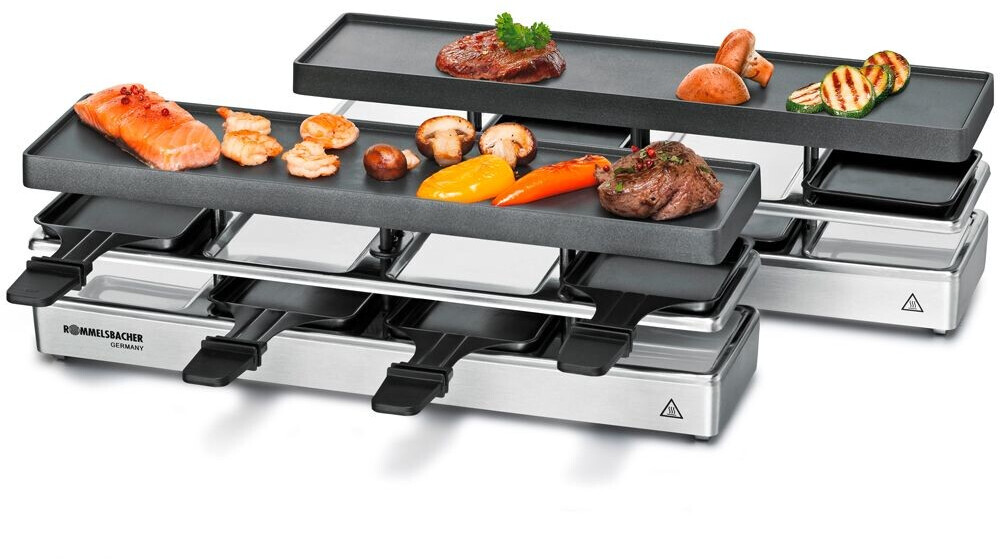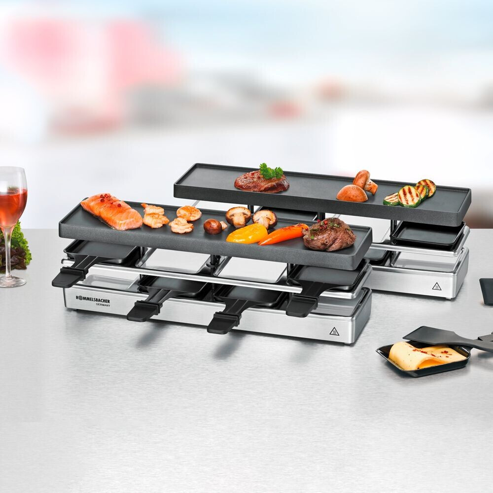 گریل باربیکیو و رَکلِت روملز باخر آلمان Rommelsbacher RC 1600 با طراحی مدرن و بدنهای از آلومینیوم دایکست، ترکیب گریل و رَکلِت را در یک دستگاه ارائه میدهد. صفحه گریل آن قابل برگرداندن است (سمت صاف و سمت شیاردار)، که اجازه میدهد هم گوشت و سبزیجات را گریل کنی و هم پنیر ذوب کنی یا غذاهای متفاوت آماده کنی. ۸ پَنِه تفلونشده با دستههای مقاوم در برابر حرارت وجود دارد که هر نفر میتواند غذای خودش را آماده کند. با ترموستات قابل تنظیم، کنترل دما آسان است و پس از پخت، قطعات جداشونده و ضد-نچسب دستگاه، کار تمیز کردن را راحت میکنند.