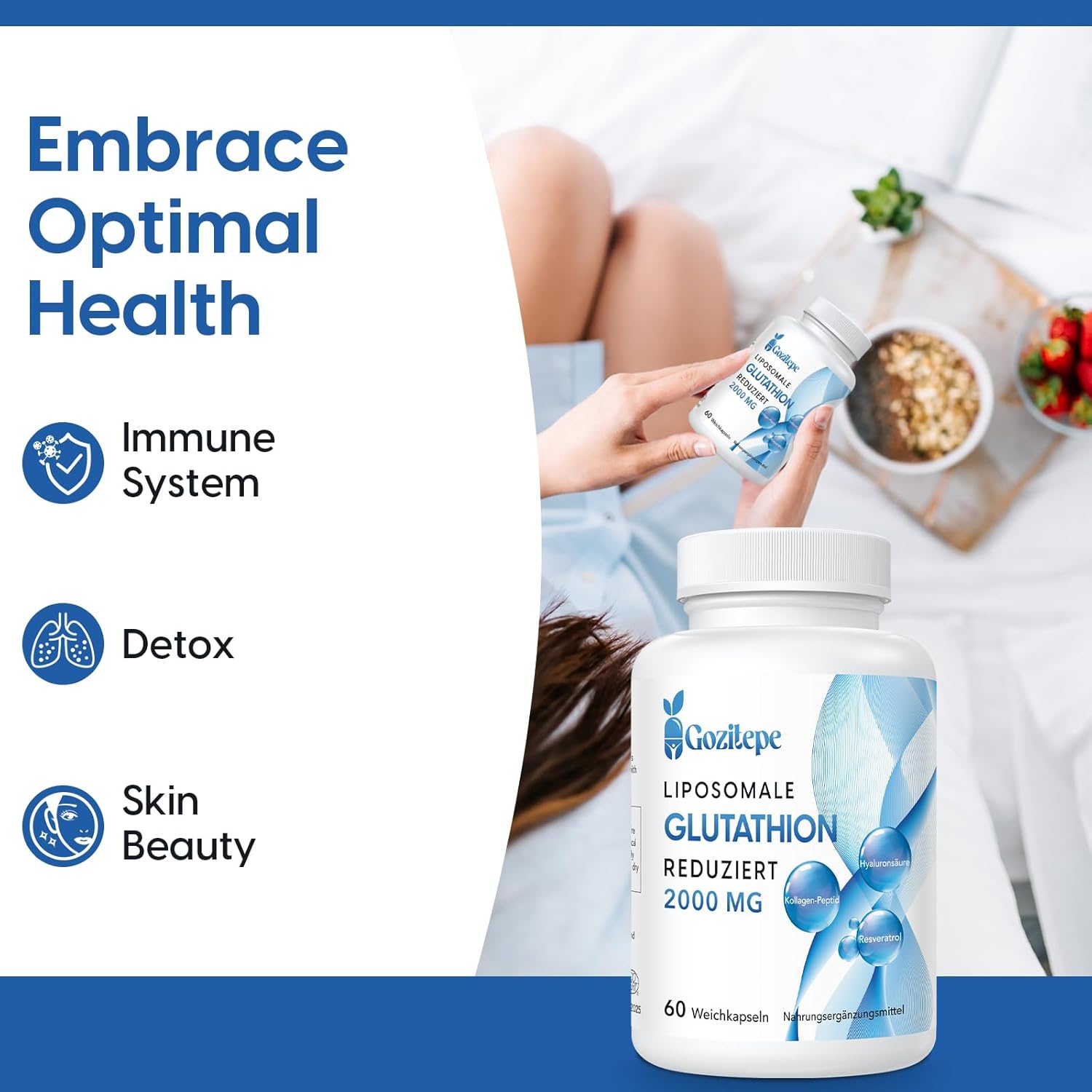 Liposomales Glutathion reduziert 2000mg pro Portion | Glutathion Ergänzung mit Hyaluronsäure + Kollagenpeptid + Resveratrol | 10x bessere Absorption (60 Stück (1er-pack)) 60 stück (1er Pack) | قیمت یورویی 23.99€