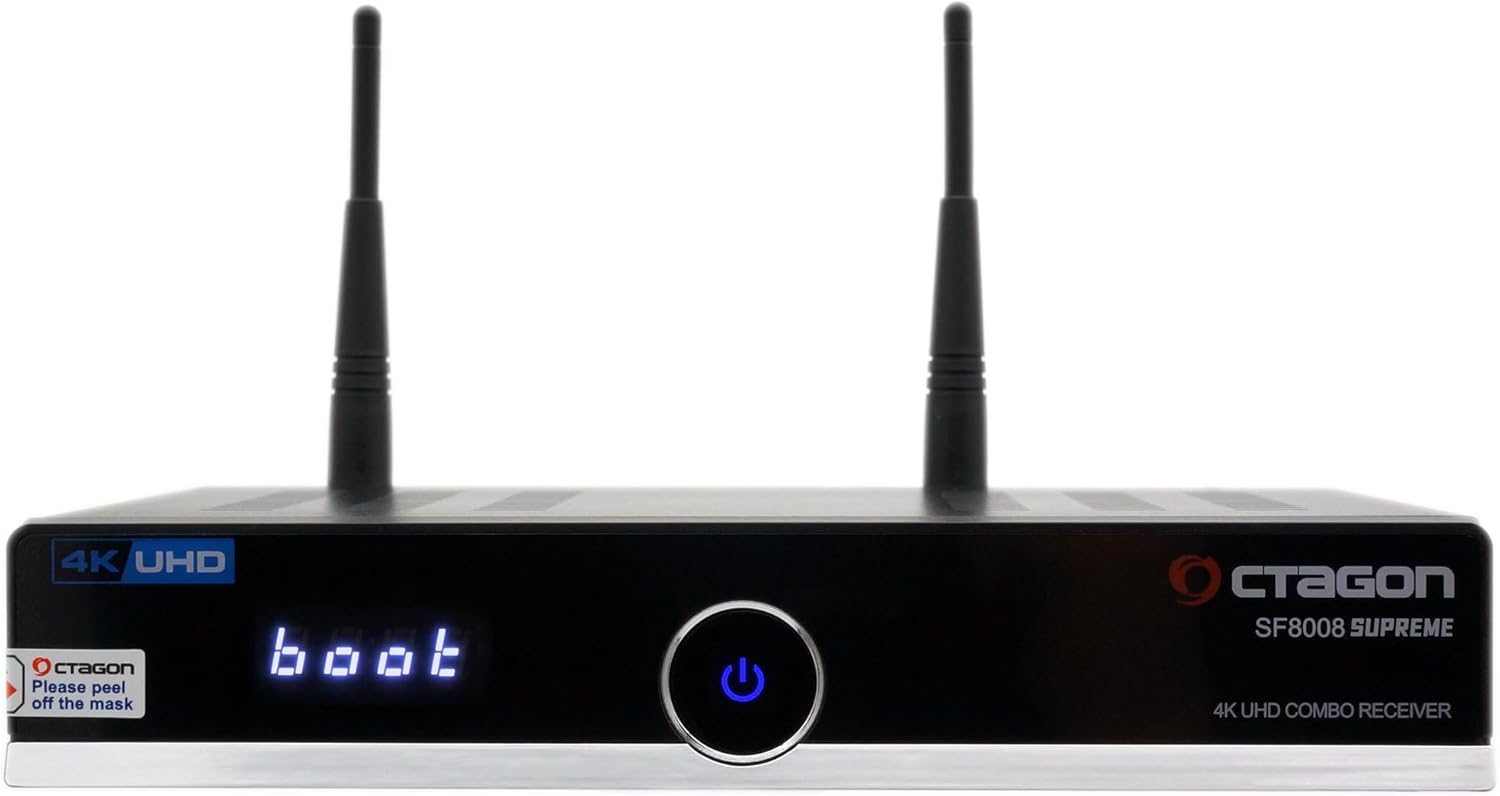 OCTAGON SF8008 4K UHD HDR Combo Receiver 1x DVB-S2X und 1x DVB-C/DVB-T2 - Satellit, Kabel/Terrestrisches Signal, E2 Linux Smart TV, Media Server, Aufnahmefunktion, EasyMouse HDMI, Dual لینک آمازون : https://www.amazon.de/dp/B08QGKWM9B?th=1&psc=1 چند منظوره: اینترنت، پخش کننده رسانه، تیونر ترکیبی ماهواره و کابل UHD، همچنین به عنوان گیرنده کمپینگ ۱۲ ولتی، قابلیت ضبط (گزینه هارد دیسک داخلی فقط از کارخانه موجود است) آیندهنگر: فناوری 4K UHD، سیستم عامل لینوکس E2، افزونهها، کلاینت چند اتاقه، گیرنده ترکیبی ماهواره و کابل IP کاربرپسند: منوی شهودی، مثلاً به زبانهای آلمانی، انگلیسی، روسی، ترکی؛ EPG توسعهیافته آخرین فناوری: پردازنده چهار هستهای ۱.۶ گیگاهرتز، ۸ گیگابایت فلش/۱ گیگابایت رم، تیونر هیبریدی، HDMI 2.0a و USB 3.0، WLAN محتویات بسته: Octagon SF8008، یک عدد DVB-S2X و یک عدد DVB-C/DVB-T2، کابل HDMI، WLAN دوگانه، ریموت کنترل، باتری، آداپتور برق