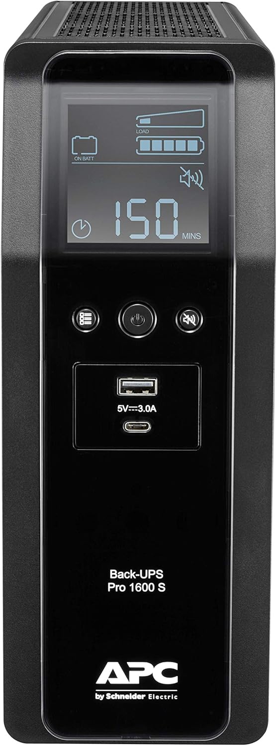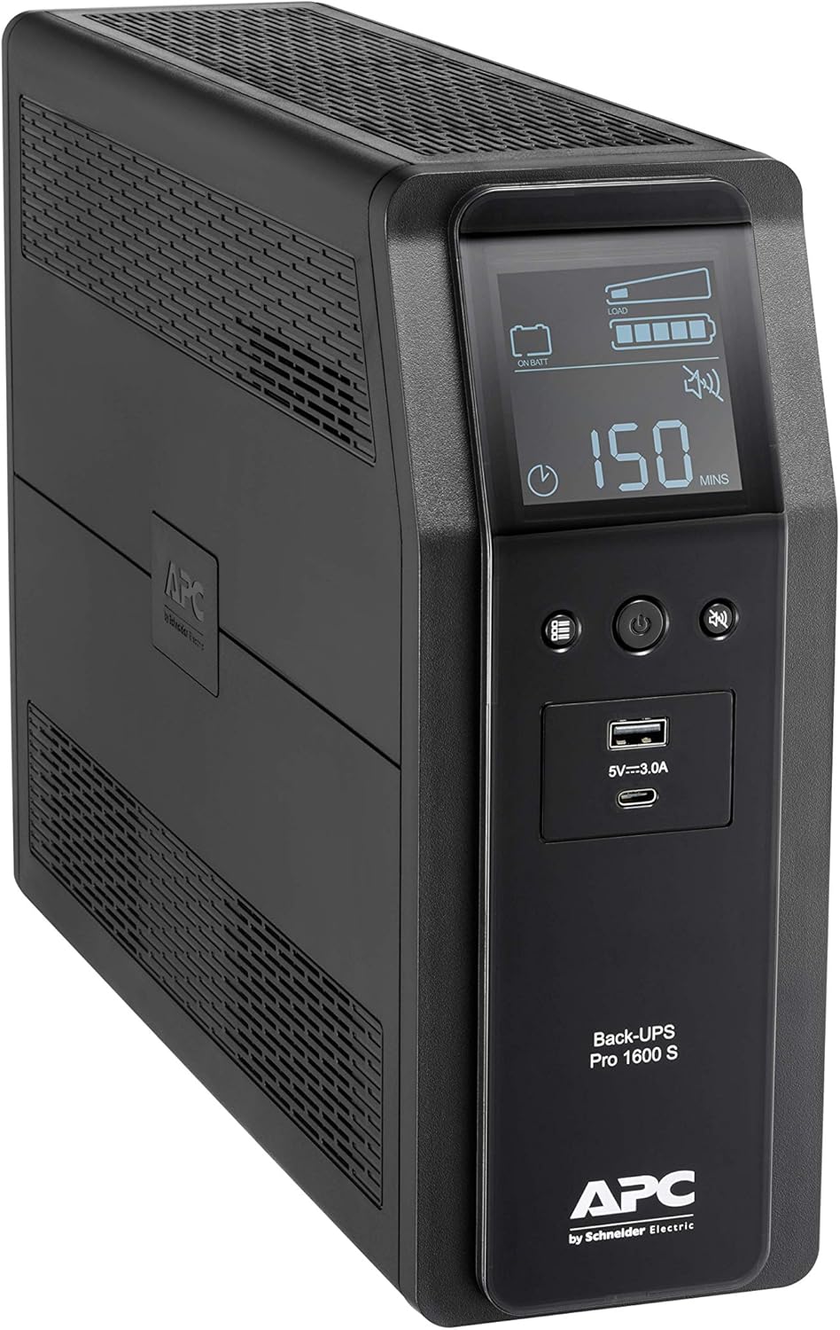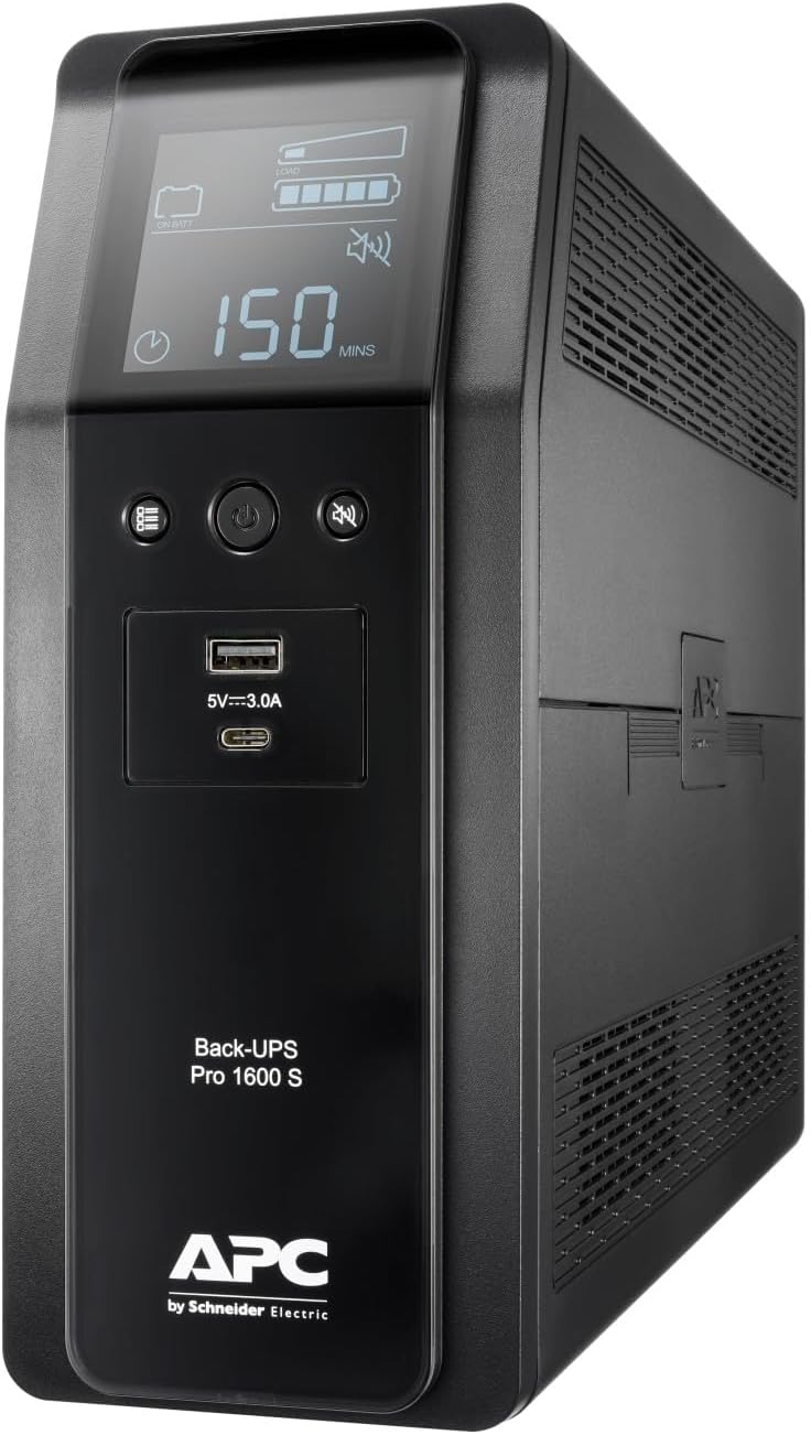 APC by Schneider Electric Back UPS PRO - BR1600SI - USV 1600VA (8 IEC Ausgänge, Multifunktionsdisplay, rein sinusförmiges Ausgangsignal) 1600 VA Leistung - SI modell IEC - Kaltgeräte Ausgänge Single لینک آمازون : https://www.amazon.de/dp/B07ZHHZYRR?th=1&psc=1 این یو پی اس ۱۶۰۰ ولت آمپری در مجموع ۸ پریز برق دارد که ۶ پریز آن پشتیبانی از برق یو پی اس و محافظت در برابر نوسانات برق را فراهم میکنند و ۲ پریز دیگر فقط محافظت در برابر نوسانات برق را ارائه میدهند. این دستگاه دارای یک AVR داخلی و یک رابط LCD با آلارمهای صوتی است. زمان کارکرد آن با ۱۰۰ وات، ۱ ساعت و ۱۸ دقیقه است. خانواده Back-UPS Pro محافظت تضمینشدهای از برق را برای سیستمهای کامپیوتری با کارایی بالا، روترها، دستگاههای ذخیرهسازی خارجی، کنسولهای بازی و سایر لوازم الکترونیکی خانگی و تجاری فراهم میکند.