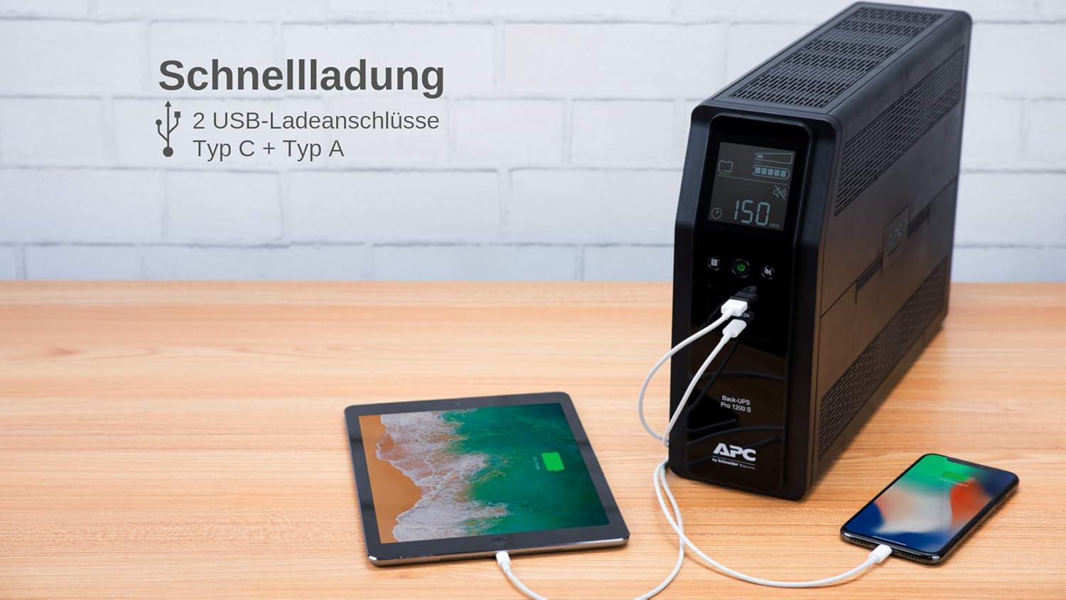 Die APC Back-UPS PRO bietet eine zuverlässige unterbrechungsfreie Stromversorgung für hochwertige Computer, Router und Modems LCD-Statusanzeige - wichtige Parameter zum USV-Status auf einen Blick; mehrere Statusanzeigen mit Balkendiagrammen zu Last- und Batteriezustand Automatische Spannungsregulierung, 1GB Netzwerk Datenleitungsschutz, 2 USB Ladeausgänge (Typ A / Typ C) 8 Ausgangsanschlüsse: 6 mit Batteriepuffer und Überspannungsschutz – 2 nur Überspannungsschutz, rein sinusförmiges Ausgangssignal Lieferumfang: APC Back UPS Pro, Benutzerhandbuch, Shutdown-Software | قیمت یورویی : 410€