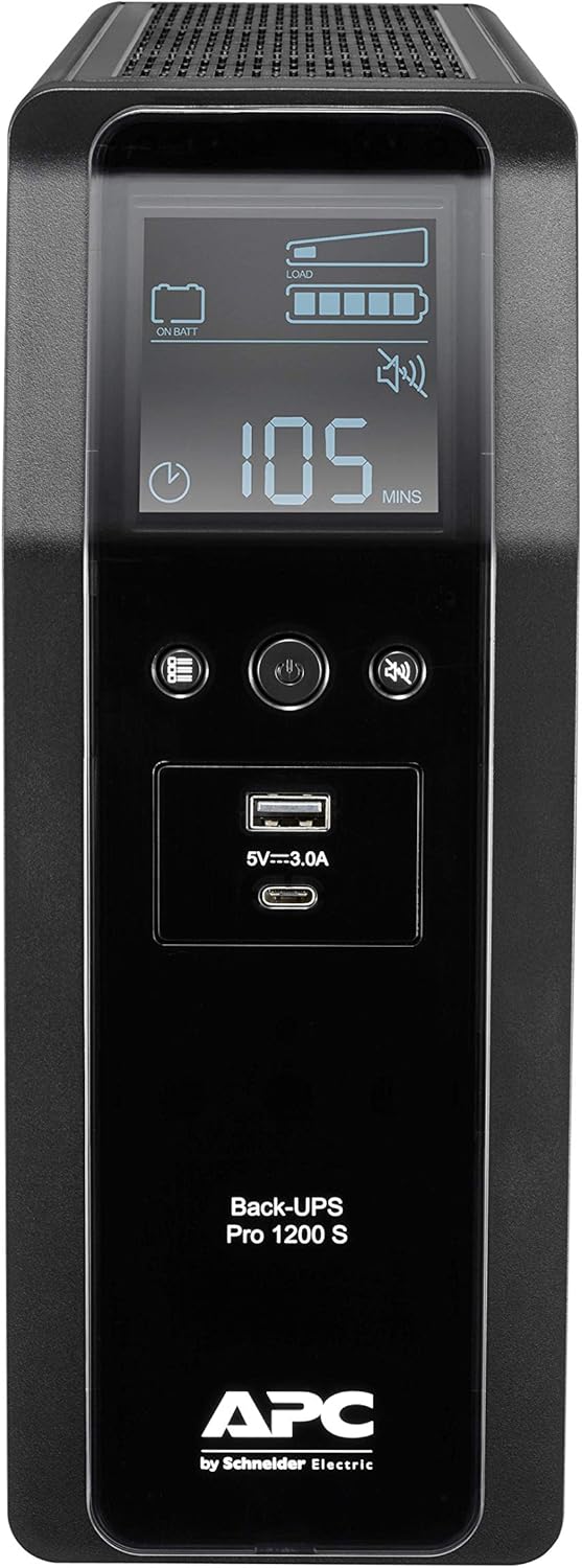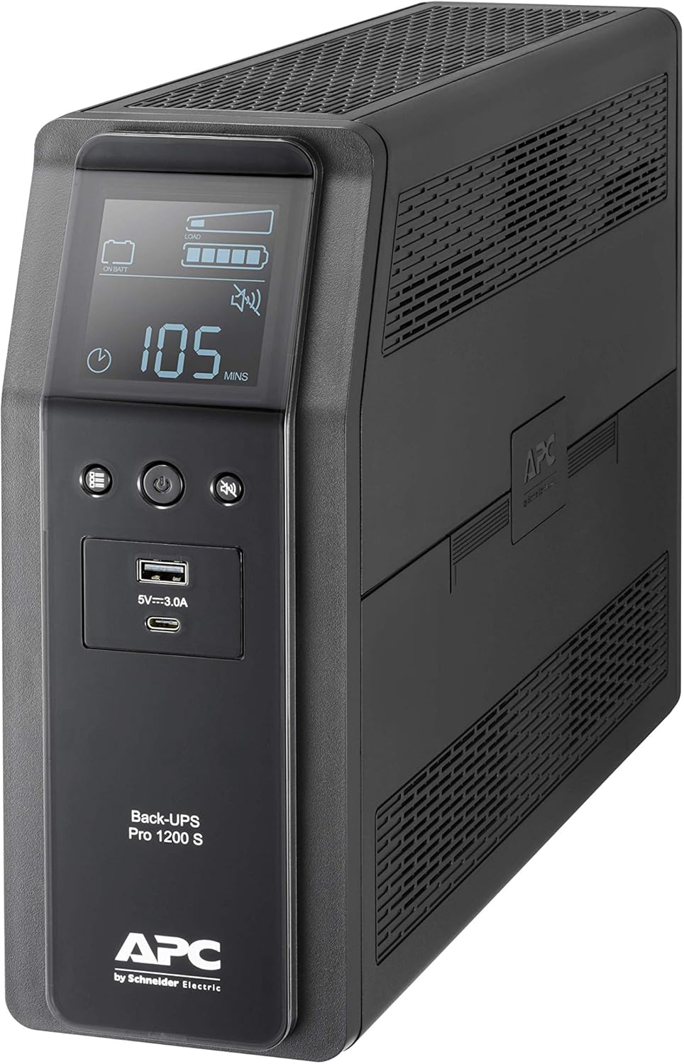 APC by Schneider Electric Back UPS PRO - BR1200SI - USV 1200VA (8 IEC Ausgänge, Multifunktionsdisplay, rein sinusförmiges Ausgangsignal) 1200 VA Leistung - SI modell IEC - Kaltgeräte Ausgänge Single لینک آمازون : https://www.amazon.de/dp/B07ZHHDTP2?th=1&psc=1 APC Back-UPS PRO برق اضطراری و قابل اعتمادی را برای رایانهها، روترها و مودمهای رده بالا فراهم میکند. نمایشگر وضعیت LCD - پارامترهای مهم وضعیت UPS در یک نگاه؛ نمایشگرهای وضعیت چندگانه با نمودارهای میلهای که وضعیت بار و باتری را نشان میدهند تنظیم خودکار ولتاژ، محافظت از خط داده شبکه ۱ گیگابایتی، ۲ خروجی شارژ USB (نوع A / نوع C) ۸ پورت خروجی: ۶ پورت با باتری پشتیبان و محافظت در برابر اضافه ولتاژ - ۲ پورت فقط محافظت در برابر اضافه ولتاژ، سیگنال خروجی سینوسی خالص دامنه تحویل: APC Back UPS Pro، دفترچه راهنمای کاربر، نرمافزار خاموش کردن