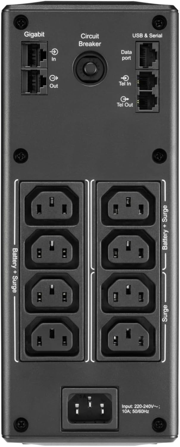 APC Back-UPS PRO برق اضطراری و قابل اعتمادی را برای رایانه‌ها، روترها و مودم‌های رده بالا فراهم می‌کند. نمایشگر وضعیت LCD - پارامترهای مهم وضعیت UPS در یک نگاه؛ نمایشگرهای وضعیت چندگانه با نمودارهای میله‌ای که وضعیت بار و باتری را نشان می‌دهند تنظیم خودکار ولتاژ، محافظت از خط داده شبکه ۱ گیگابایتی ۸ پورت خروجی: ۶ پورت با باتری پشتیبان و محافظت در برابر نوسانات برق - ۲ پورت فقط محافظت در برابر نوسانات برق دامنه تحویل: APC Back UPS Pro، دفترچه راهنمای کاربر، نرم‌افزار خاموش کردن