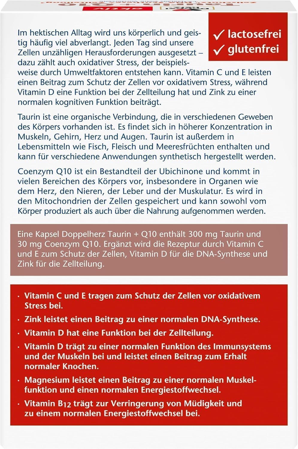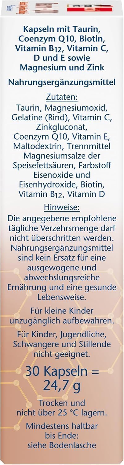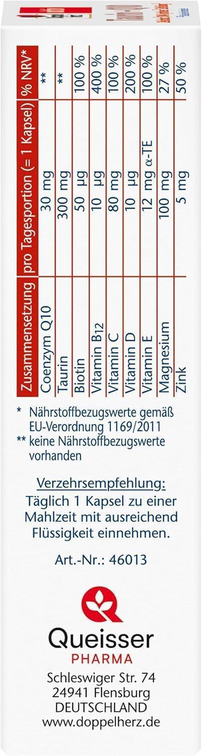 TAURIN + COENZYM Q10: Eine Kapsel Doppelherz Taurin + Q10 enthält 300 mg Taurin und 30 mg Coenzym Q10 CELL-PROTECT: Vitamin C und Vitamin E leisten einen Beitrag zum Schutz der Zellen vor oxidativem Stress DNA-SYNTHESE: Zink leistet einen Beitrag zu einer normalen DNA-Synthese ZELLTEILUNG: Vitamin D hat eine Funktion bei der Zellteilung und trägt zu einer normalen Funktion des Immunsystems bei - zudem leistet Vitamin D einen Beitrag zum Erhalt normaler Knochen LIEFERUMFANG: 30 Kapseln - Nahrungsergänzungsmittel -Kapseln mit Taurin, Coenzym Q10, Biotin, Vitamin B12, Vitamin C, D und E sowie Magnesium und Zink - Nettofüllmenge: 24,7 g | قیمت یورویی : 6.55€