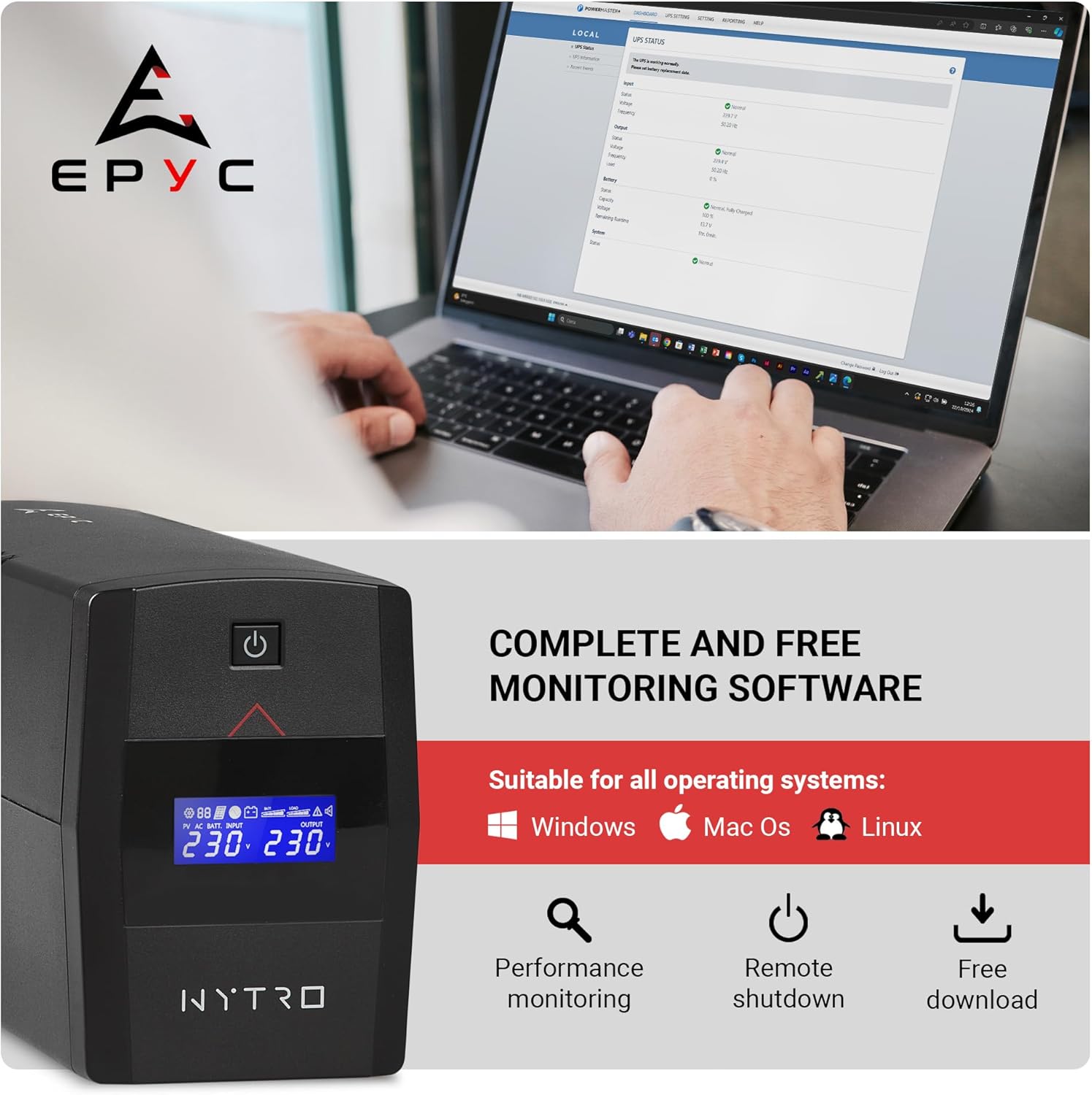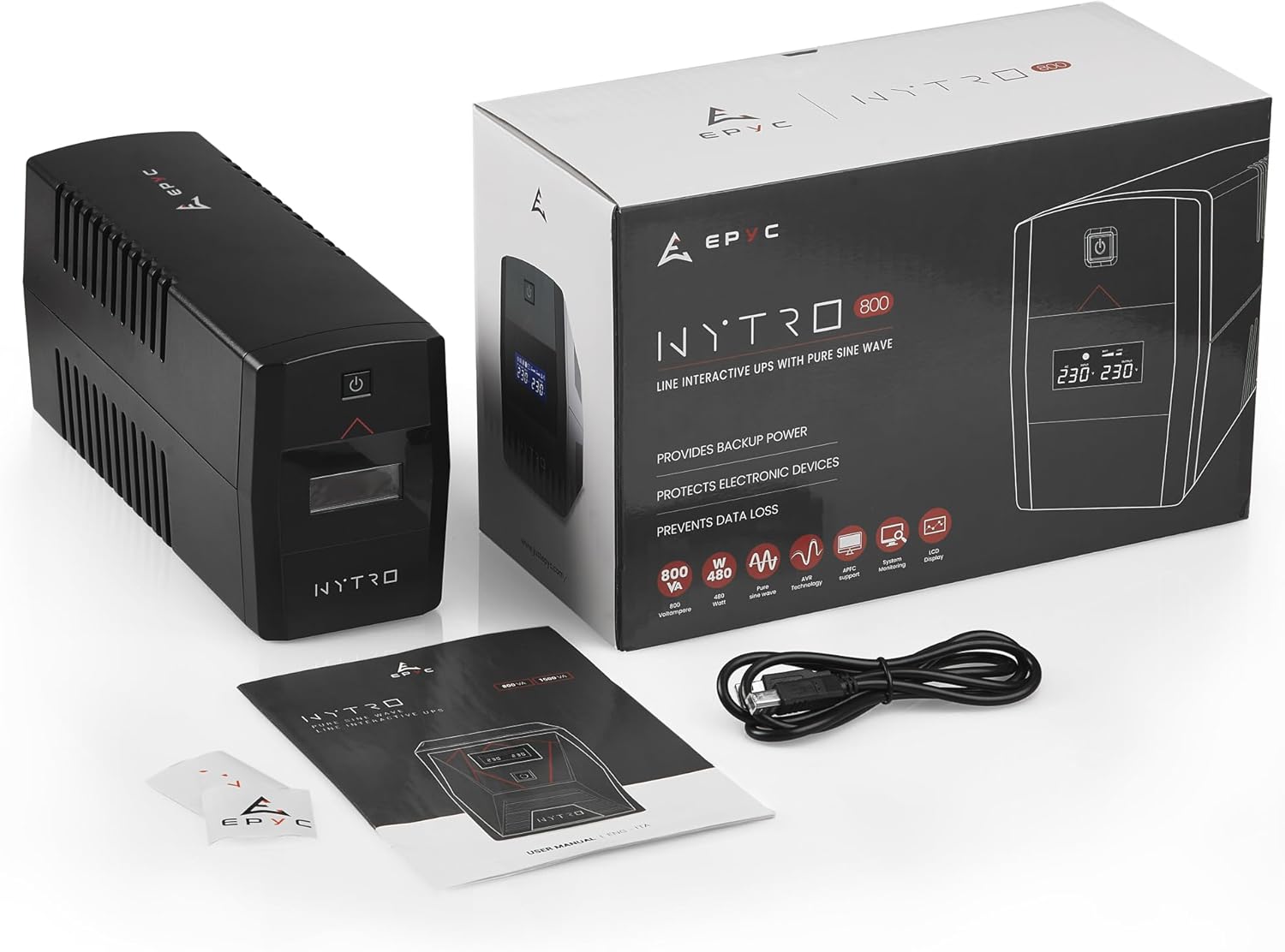 EPYC® NYTRO - USV Reiner Sinus, 800VA / 480 Watt, UPS, USV für Gaming-PCs, Aktiven PFC-Netzteilen, MAC und Konsolen, Unterbrechungsfreie Stromversorgung, 2X Schuko Ausgängen 800VA / 480Watt